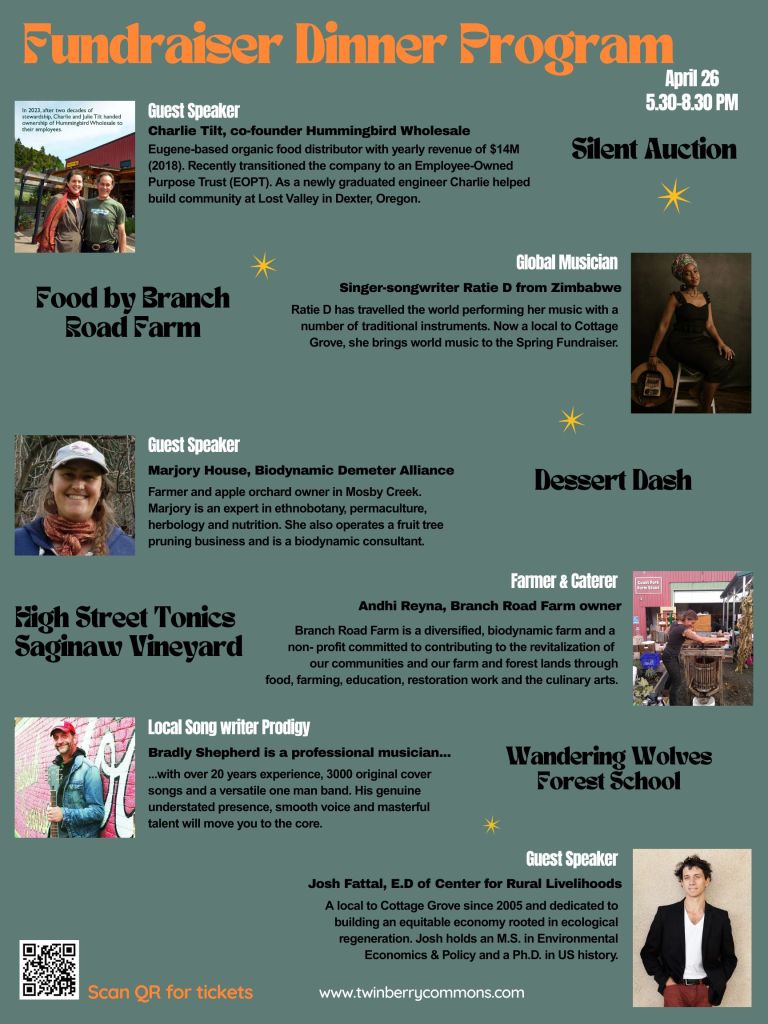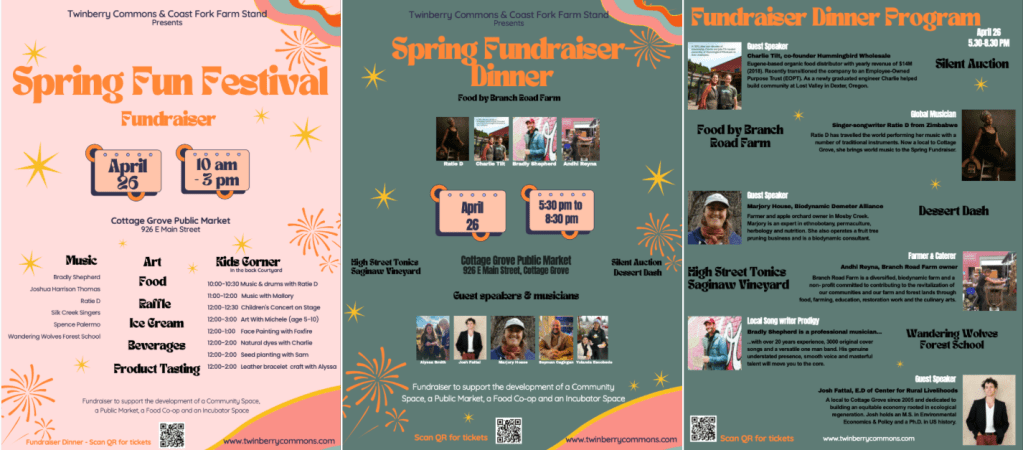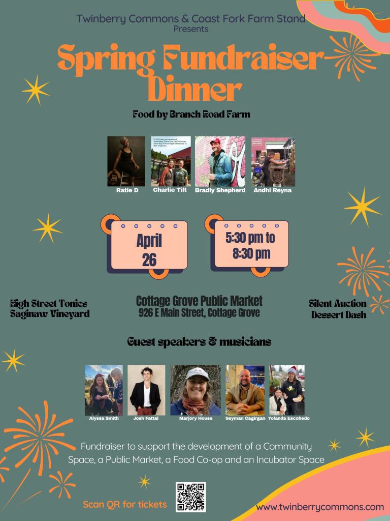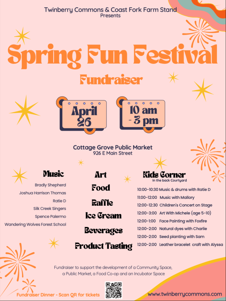April 26th we are organizing two events. During the day we will have lots of happenings at the Cottage grove Public Market (926 E. Main Street) from 10 am to 3 pm.